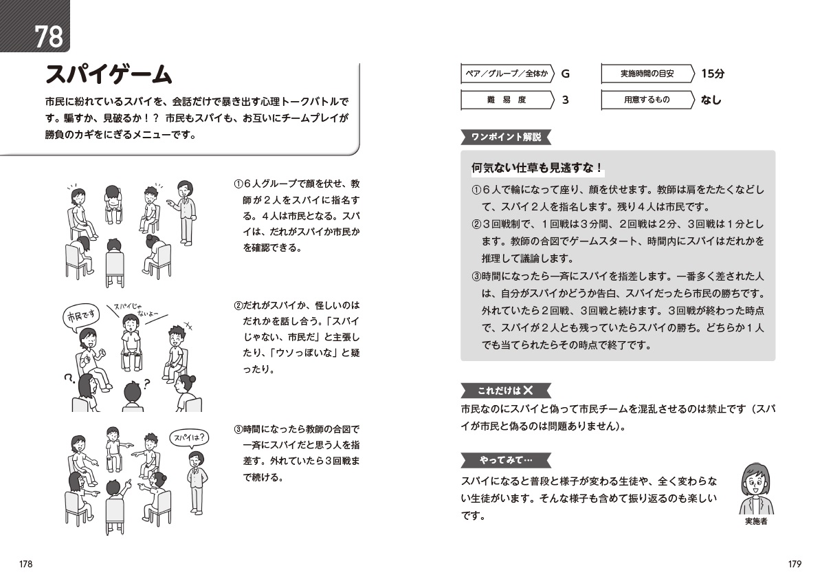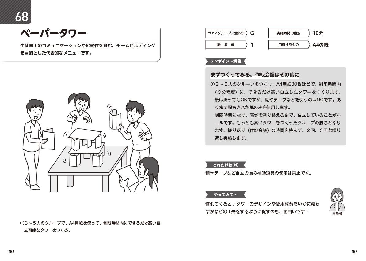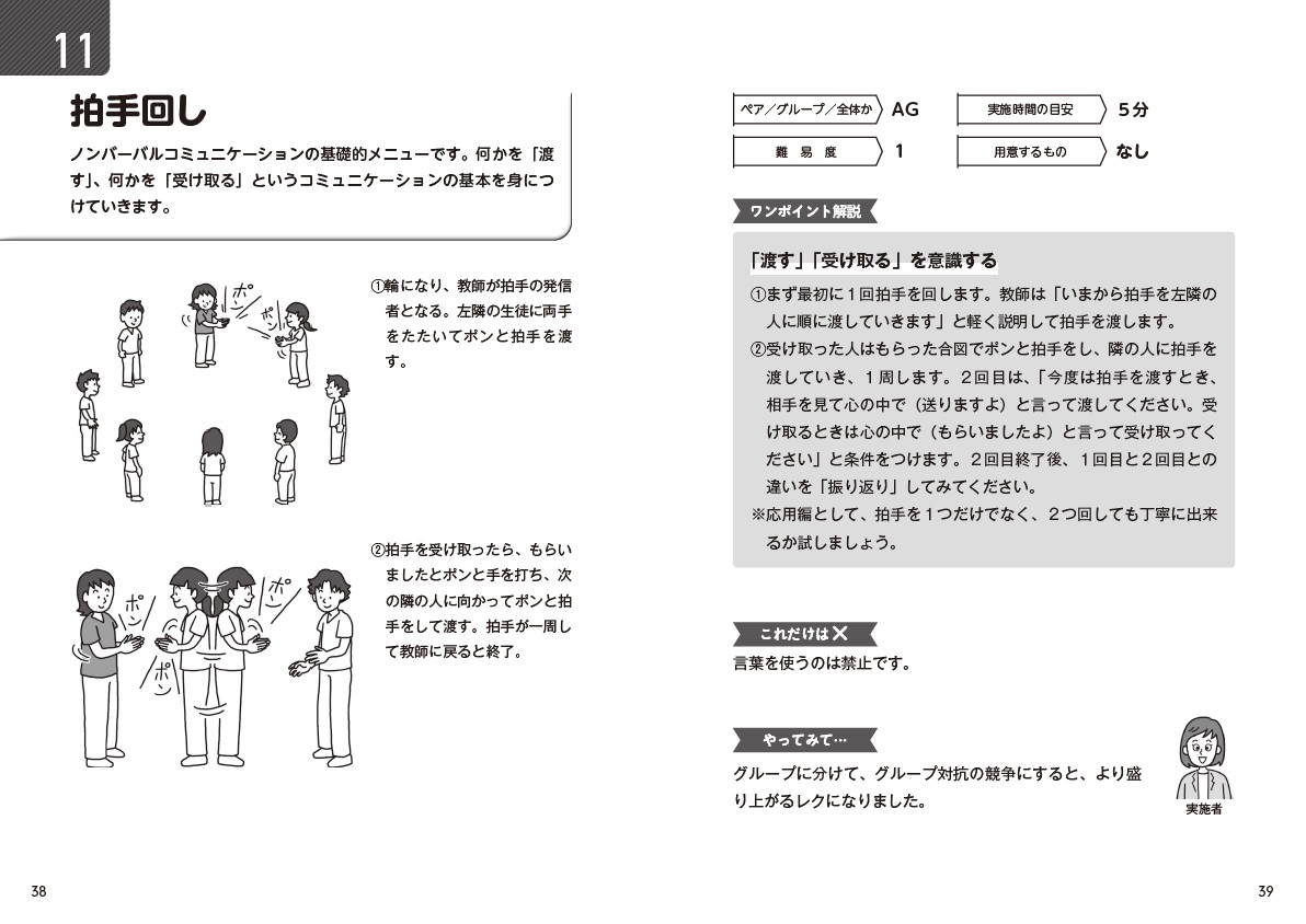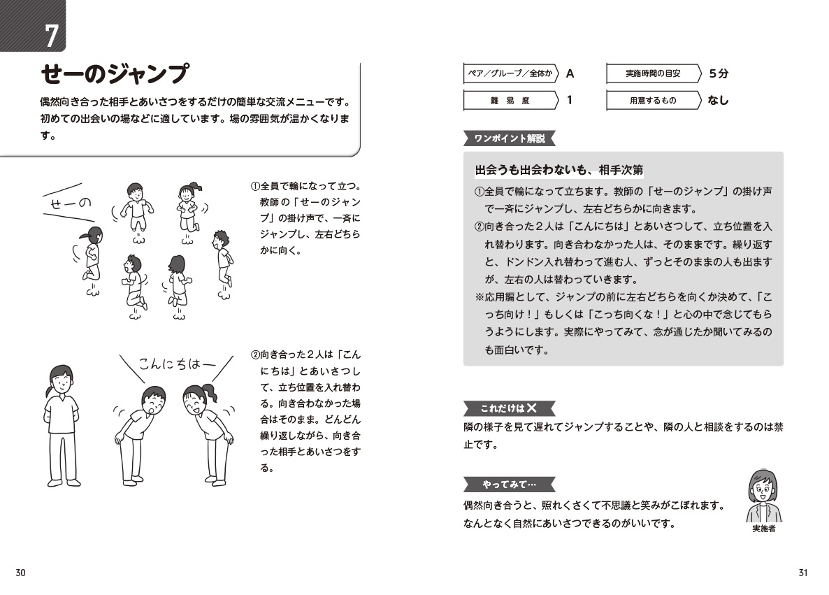本書は、レクのプロである著者が実際に中学生・高校生に行って好評だったものばかり集めています。イラストと解説もあるので、空いた時間にさっと行うこともできます。