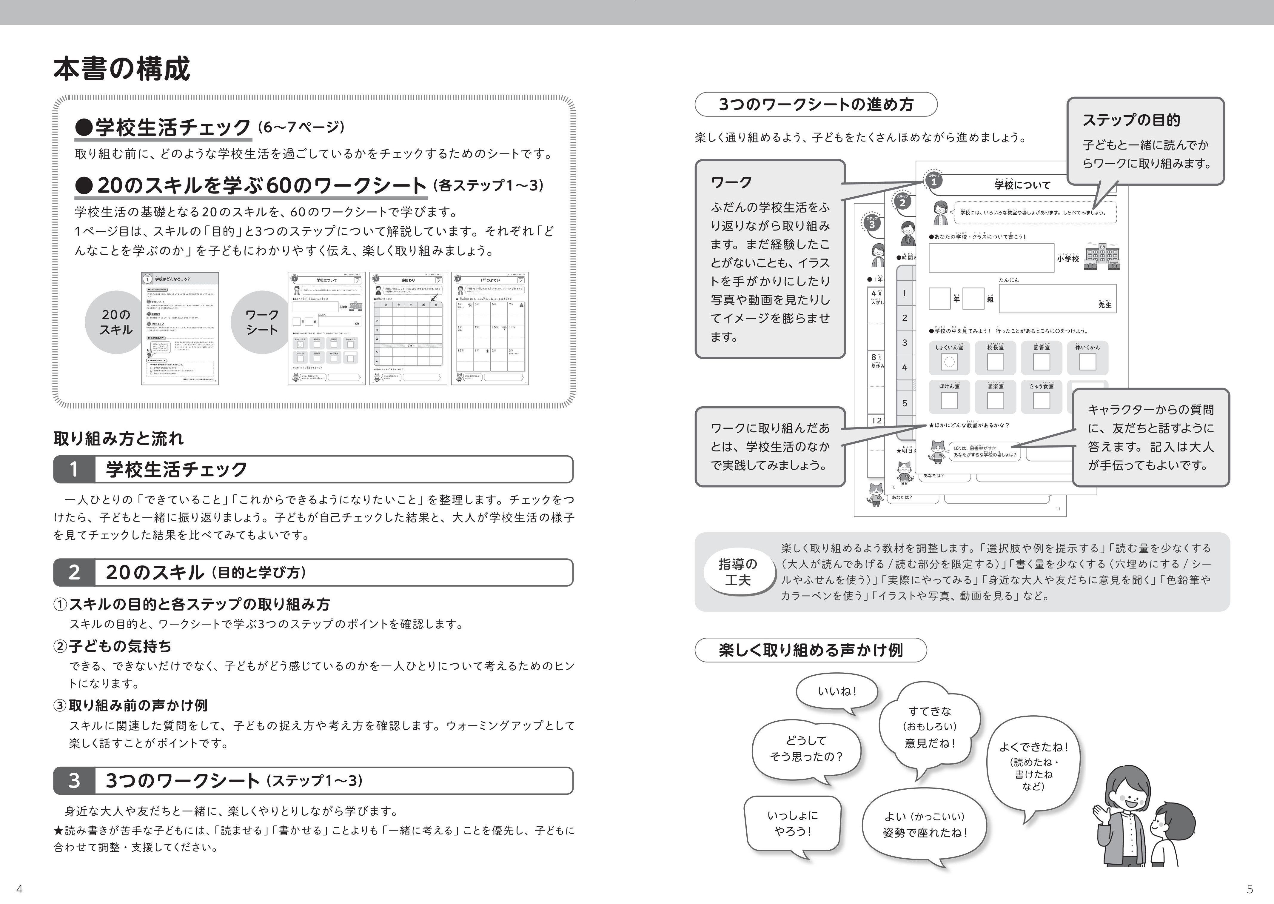 入学前からスムーズに学校生活イメージすることができて、学校生活を頑張る小学校1・2年生が、安心して友だち、先生とコミュニケーションをとって学校生活を送ることができるようになるスキルを身に付けるためのワークブック。各項目に先生用の解説1ページ、子どもが自分で取り組めることができる20のスキルに各3ページのワーク構成で、親しみやすいイラストが満載。先生や保護者に向けた「取り組み前の声がけ例」も掲載。
