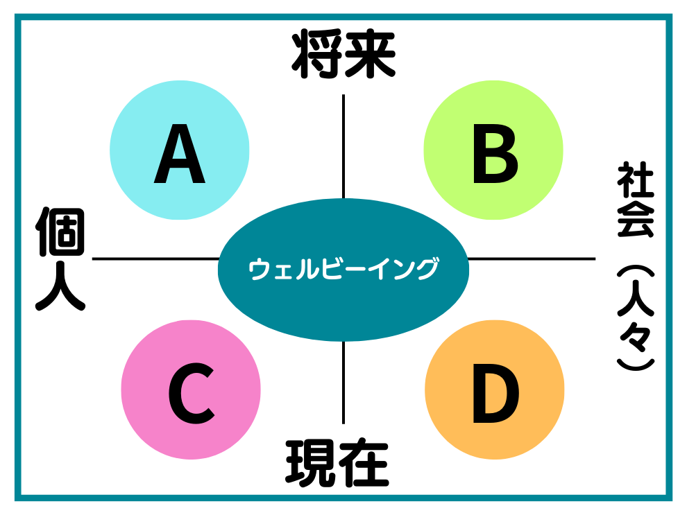 そこで、ウェルビーイングを考えるために、①時間軸(将来/現在)、②対象軸(個人/社会)をクロスさせた以下の図を作成してみました。