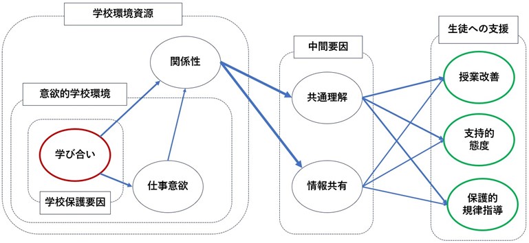 この日頃からのインフォーマルなサポートを含む「学び合い」は、管理職や教職員、児童生徒、保護者との「関係性」に肯定的な影響を及ぼしていることが明らかになりました。もちろん、学校の組織文化・風土を良好なものとしていく上で、「学び合い」は無数の要因のうちの一つにすぎないかもしれません。ですが、今回の「学校指導体制調査研究」の結果は、教え合いや支え合いといった側面も含む、「学び合い」を学校として、どのように工夫し進めていくことができるか、管理職やミドルリーダー、若手の先生、それぞれの立場で、意識して実行に移していくことの意義を強調するものといえます。 良質な生徒指導を行うには、それを担う、学校の先生方一人一人が、管理職や同僚の先生方から大切にされ、尊重され、支援を受けているという実感が必要なのだと考えます。そして、この実感は、管理職や同僚の先生方からだけでも十分ではなく、願わくば、保護者や地域からも必要なのだと考えます。