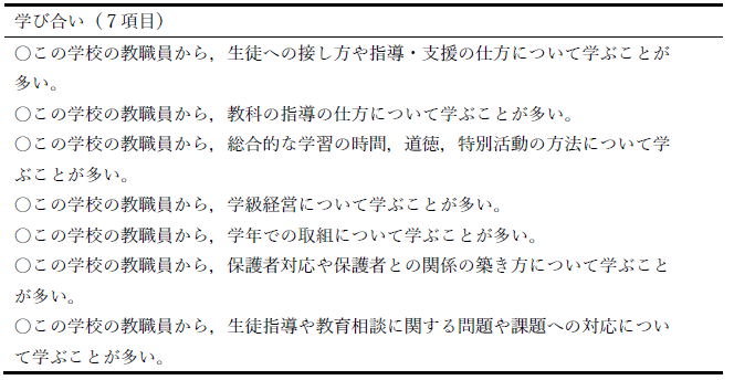 上の表にある通り「学び合い」の各質問項目は、決して授業研究といった大掛かりで、フォーマルな学び合いのみを想定したものではありません。児童生徒や保護者、地域の多様化が進む中で、ベテラン、若手といった経験年数を問わず、教育上の問題や困難に直面することは多くあるでしょう。また、地域によっては年齢構成の二極化等が進み、組織マネジメントの課題に見舞われている学校も多くあると思われます。そうした状況にも鑑み、この「学び合い」については、どれだけ学校の先生方一人一人が、周囲から生徒指導や教育相談、保護者対応、日々の授業等について、サポートを得られやすいか、そして、そのサポートを通して、気付きを得て、学びにつなげられているかということを念頭に設定したものです。