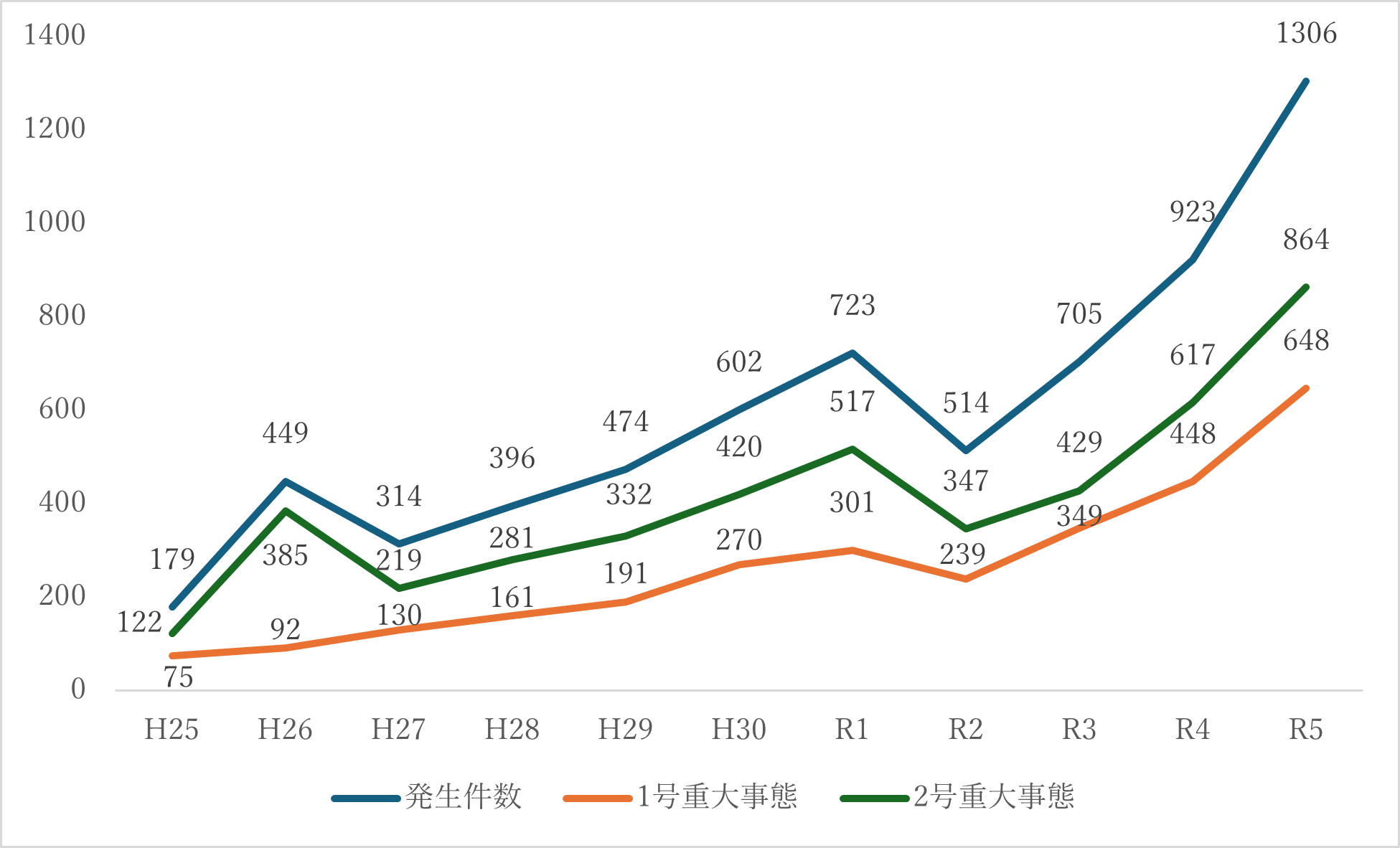 文部科学省の「令和5年度児童生徒の問題行動・不登校等生徒指導上の諸課題に関する調査について」によれば、いじめの重大事態の発生件数は図1のように、1,306件であり、そのうち、1号重大事態(生命心身財産重大事態)は648件、2号重大事態(不登校重大事態)は864件となっています*2。なお、図1は、1件の重大事態が、1号重大事態と2号重大事態の双方に該当する場合、それぞれの項目に計上しており、864件と648件を足して1,306件にならないのはそのためです。