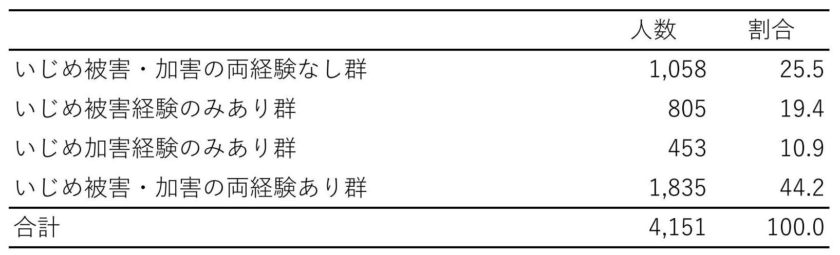 前回の再分析と異なるのは、いじめの8つの行為類型について、被害経験だけでなく、加害経験の回答結果も用いたことです。2019年度に1回、2020年度と2021年度はそれぞれ2回ずつ、計5回の全ての調査に対して、転校せずに、いじめの被害と加害の経験に関する質問項目計16項目に回答した生徒は、4,151名でした(いずれかの項目に無回答があった生徒は除いて算出)。