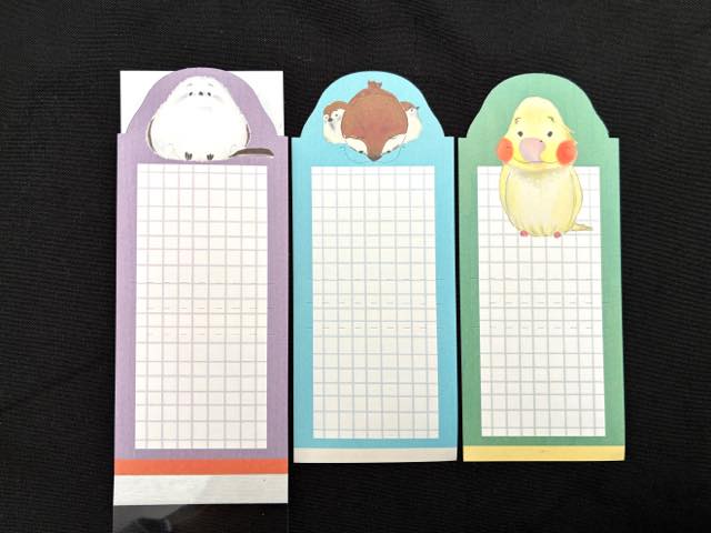 見た目は細長いメモです。大人でも使える、落ち着いていて、かつ遊び心のある生き物の愛くるしいイラストが描かれています。